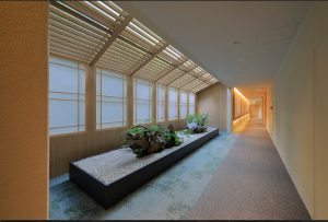 客室へと続く廊下は、ロビーの開放感から